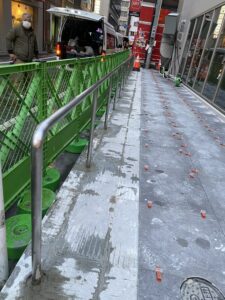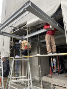 鉄骨庇下地の取付。1本最高170キロ。チェーンブロックで吊り上げて取付